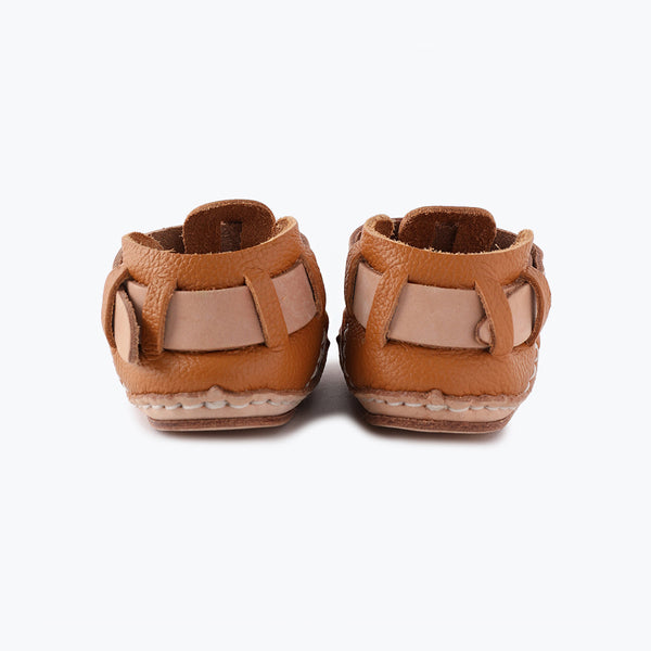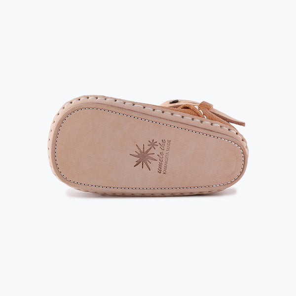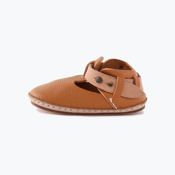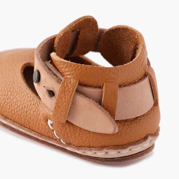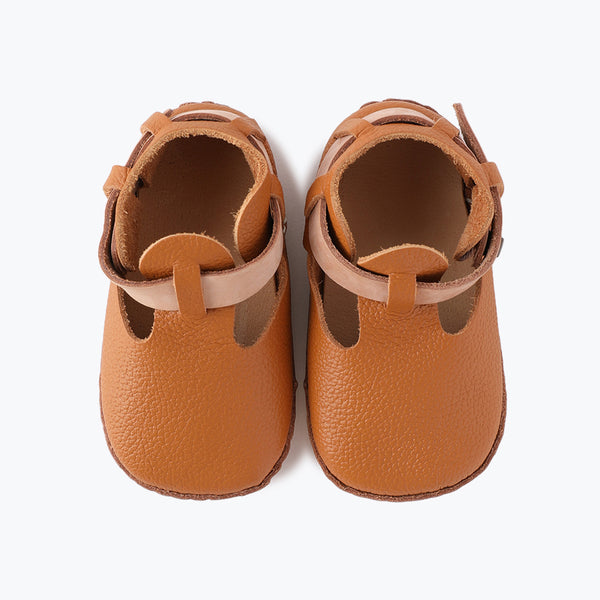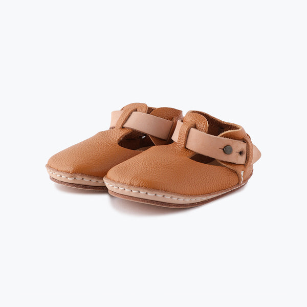 定番のTストラップタイプで、ヌメ革のベルトがポイント。