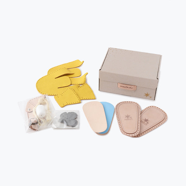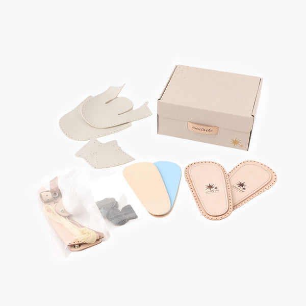 針穴を拾って縫うだけで靴が出来上がるベビー用シューズキット。
